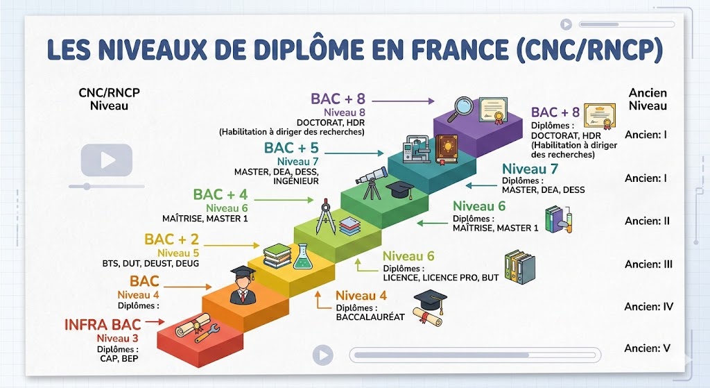 Le tableau ci-dessus présente les équivalences entre les niveaux du Cadre national des certifications françaises (CNC) et les huit niveaux du CEC. Il offre une vue claire de la progression des compétences et constitue un outil pratique pour soutenir la mobilité académique et professionnelle des apprenants et des travailleurs.